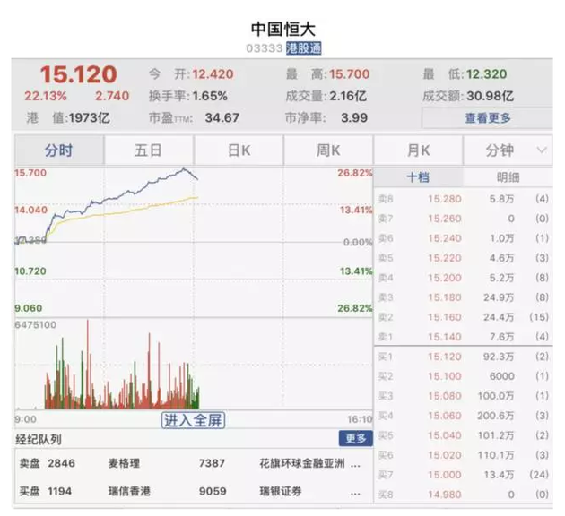 香港內(nèi)房股方面,中國(guó)恒大連續(xù)第七個(gè)交易日升破歷史新高,一度上漲近24%,創(chuàng)2009年11月以來(lái)最大漲幅,市值一度突破2000億港元。