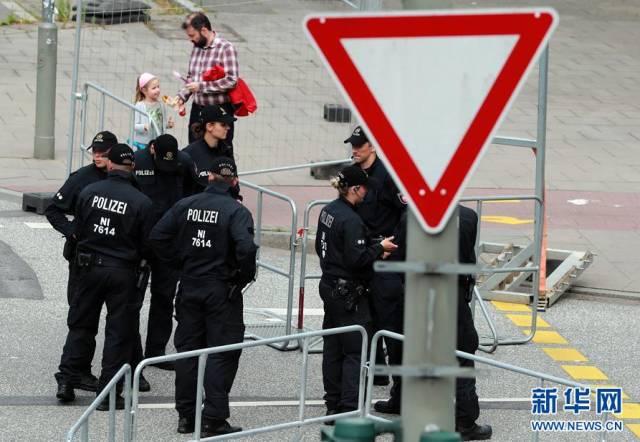 7月5日,在德國漢堡,警察在二十國集團領導人峰會會場附近執勤。新華社記者 羅歡歡 攝