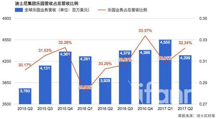 分部門來看,尤其亮眼的是迪士尼樂園業務,2017年第二財季迪士尼樂園總營收為42.99億美元,同比上漲9%。