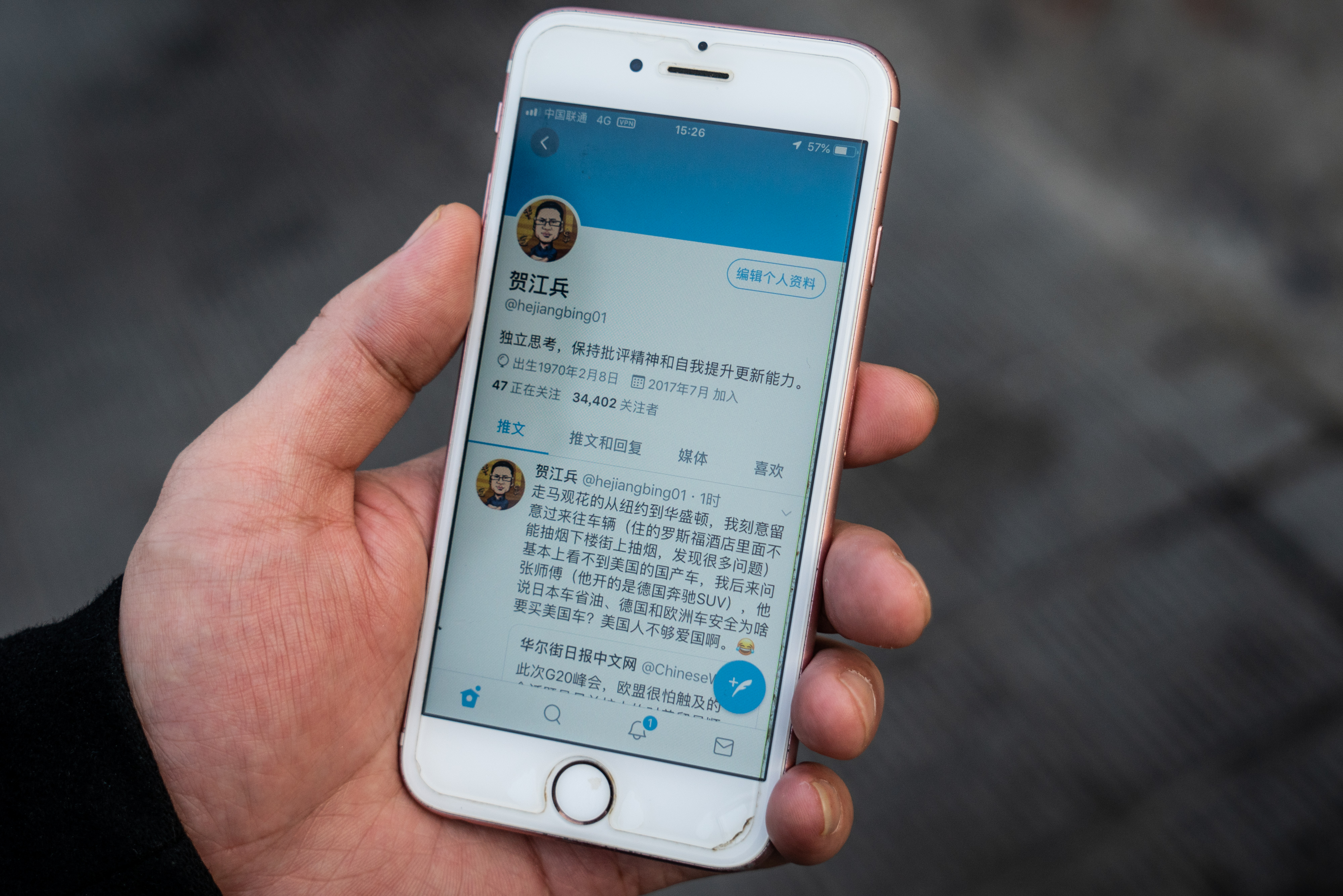 ©嚴聰為華盛頓郵報通過Getty Images 48歲的金江學者何江兵于2018年11月30日在中國北京的手機上展示了自己的Twitter檔案。