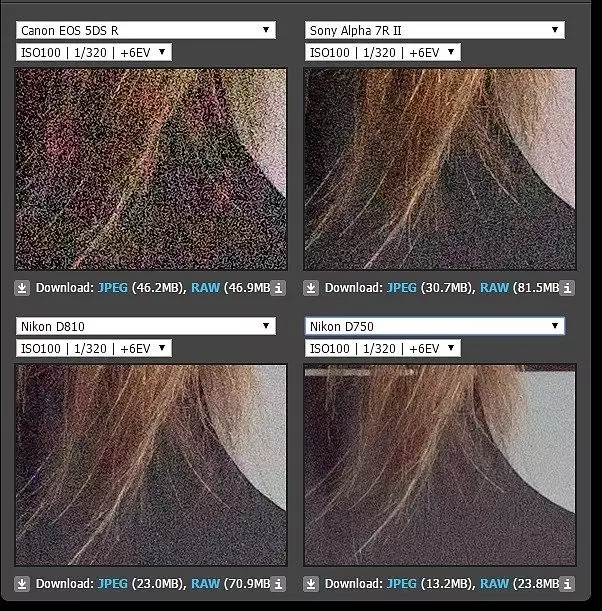 最后得出尼康>索尼>佳能這個結果,估計很多人大跌眼鏡。實際拍攝中,也許曝光提亮2~3擋,差別感覺不出來,但要提高4~5擋,D810的優勢還是能夠看出來的。