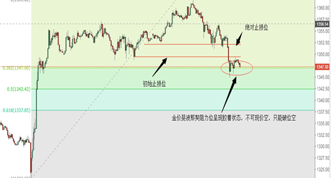 在以前期低點23和前期高點61為單位1,進行斐波那契分割,得到斐波那契線譜,在0.382附近,出現了金價的膠著狀態。因此提出一下策略。
