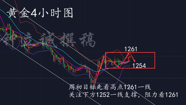 黃金操作建議:回調1252附近做多,止損1247,目標看1260-1262;我們可以看到黃金自1309-1237第三波加速下跌后出現V形反轉形態,隨后出現一個三角收斂抉擇方向的整理形態。黃金自1237反彈1261已經出現24美金的反彈力度,周初目標先看高點1261一線,關注下方1252一線支撐,阻力看1261。