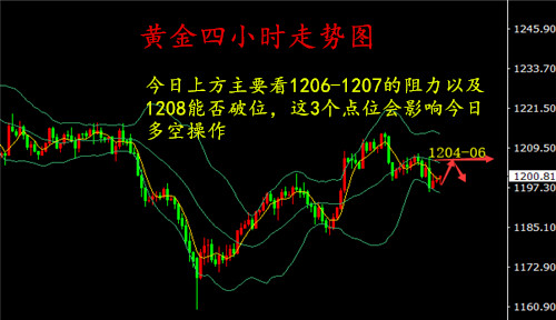目前按照日線周期來看,隔日的下跌空間,促使日線收陰,試探了日線布林的中軌,但收線在1199附近。今早黃金表現(xiàn)不是極弱有向上反彈的趨勢。黃金早盤出現(xiàn)了小幅的反抽行情,但是在1203-1204一線受阻,所以湯鑫偉認(rèn)為亞歐盤不能直接追空,日內(nèi)上方暫時壓制在1203-1204附近,我認(rèn)為主思路以反彈做空為主。我認(rèn)為黃金要實現(xiàn)真正的上漲行情,那么必須在今日突破1208一線,否則如果再次走調(diào)整,那么這波反抽很有可能夭折,短期來看,黃金方向并不是很明確,不過日內(nèi)不破位1196一線,我個人還是偏向于多頭。今日分水嶺1196和1208